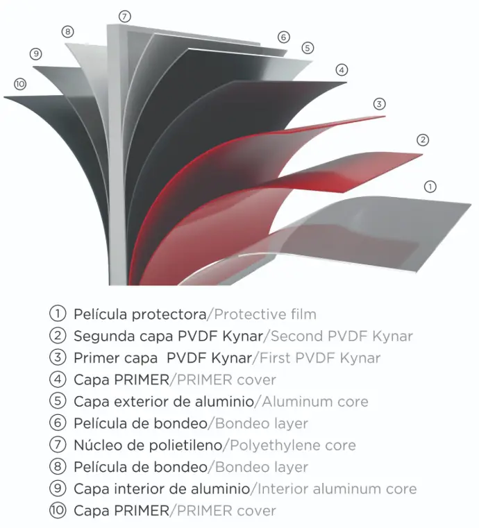 El panel compuesto de aluminio (ACP, por sus siglas en inglés) es un material de construcción que consiste en dos capas delgadas de aluminio que encierran un núcleo no metálico, generalmente de polietileno o un material mineral. Este diseño proporciona una combinación de ligereza, rigidez y durabilidad, lo que lo convierte en un material popular en diversas aplicaciones arquitectónicas y de diseño.